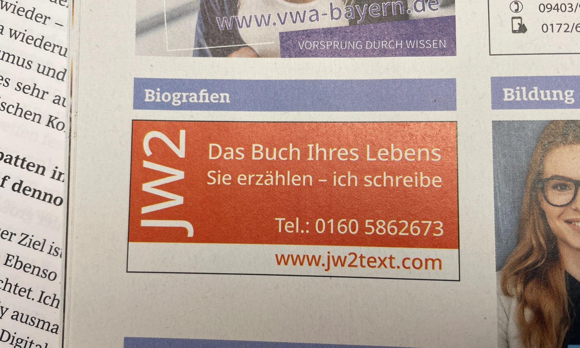 Ich schreibe Bücher, dachte ich angesichts des vielen bedruckten Papiers, das mich umgibt. Einer meiner Schwerpunkte als Autorin sind Biografien, die gedruckt, in die Hand genommen und analog gelesen werden. Warum also nicht einmal mit einer Printanzeige für meine Dienstleistung werben? Ich probierte es und stellte fest: Print wirkt. Meine Anzeige im IHK-Magazin „Wirtschaft konkret“ vom Januar 2024 wirbt für „Das Buch Ihres Lebens“.