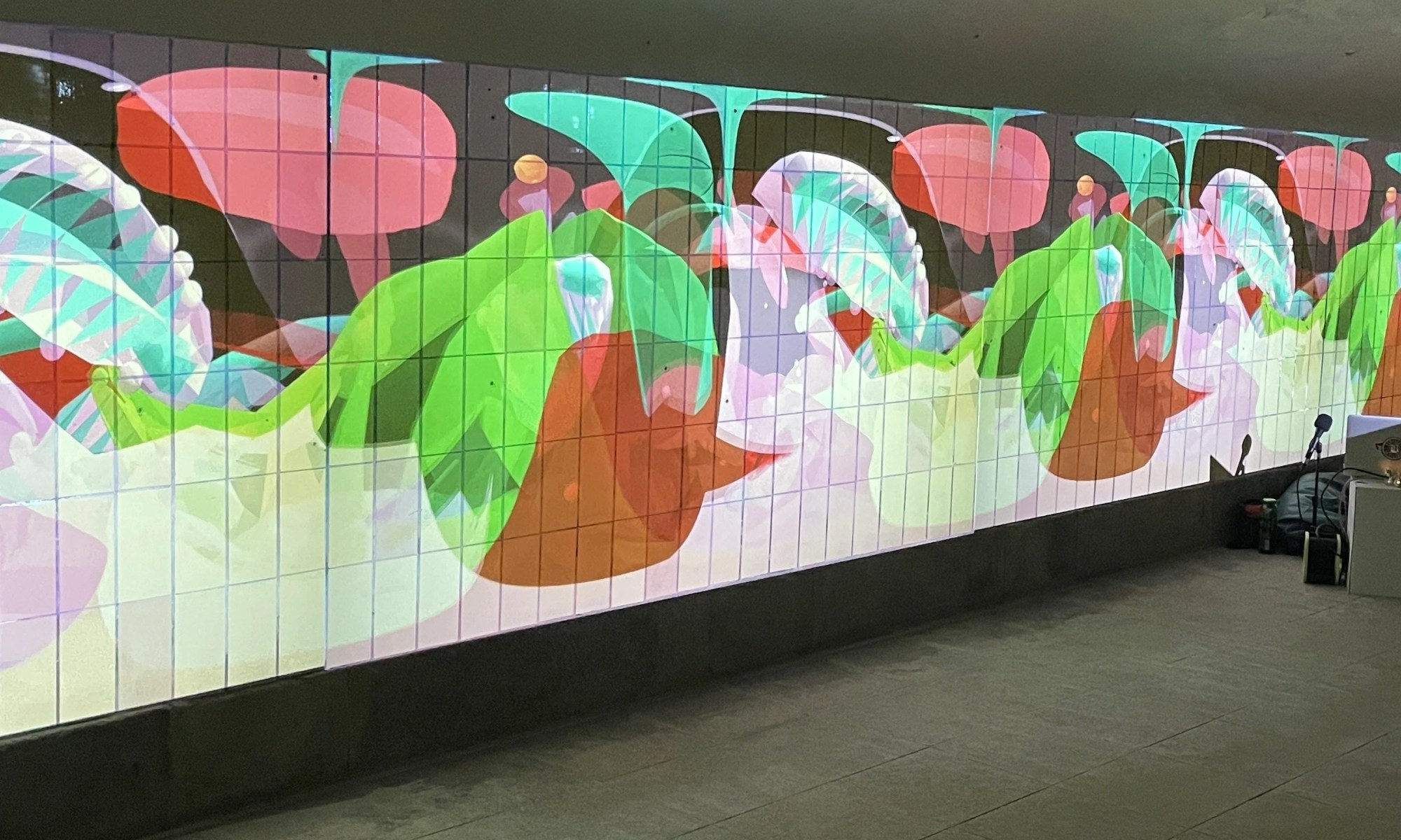 Als wären es Geschichten aus 1001 Nacht, pulsieren die aus unendlich vielen Farbflächen zusammengesetzten Teile von Blüten über die Fliesen der ehemaligen Unterführung am Hauptbahnhof in Regensburg. „Transcendent Echoes of Transcendent Realms“ nennt Barbara Herold ihre Augmented Reality Installation im donumenta ART LAB Gleis 1. Für die digitale Rauminstallation der Medienkünstlerin ist die 60 Meer lange ehemalige Bahnhofsunterführung, der Ausstellungsraum des donumenta e.V. in Regensburg, ein idealer Raum.