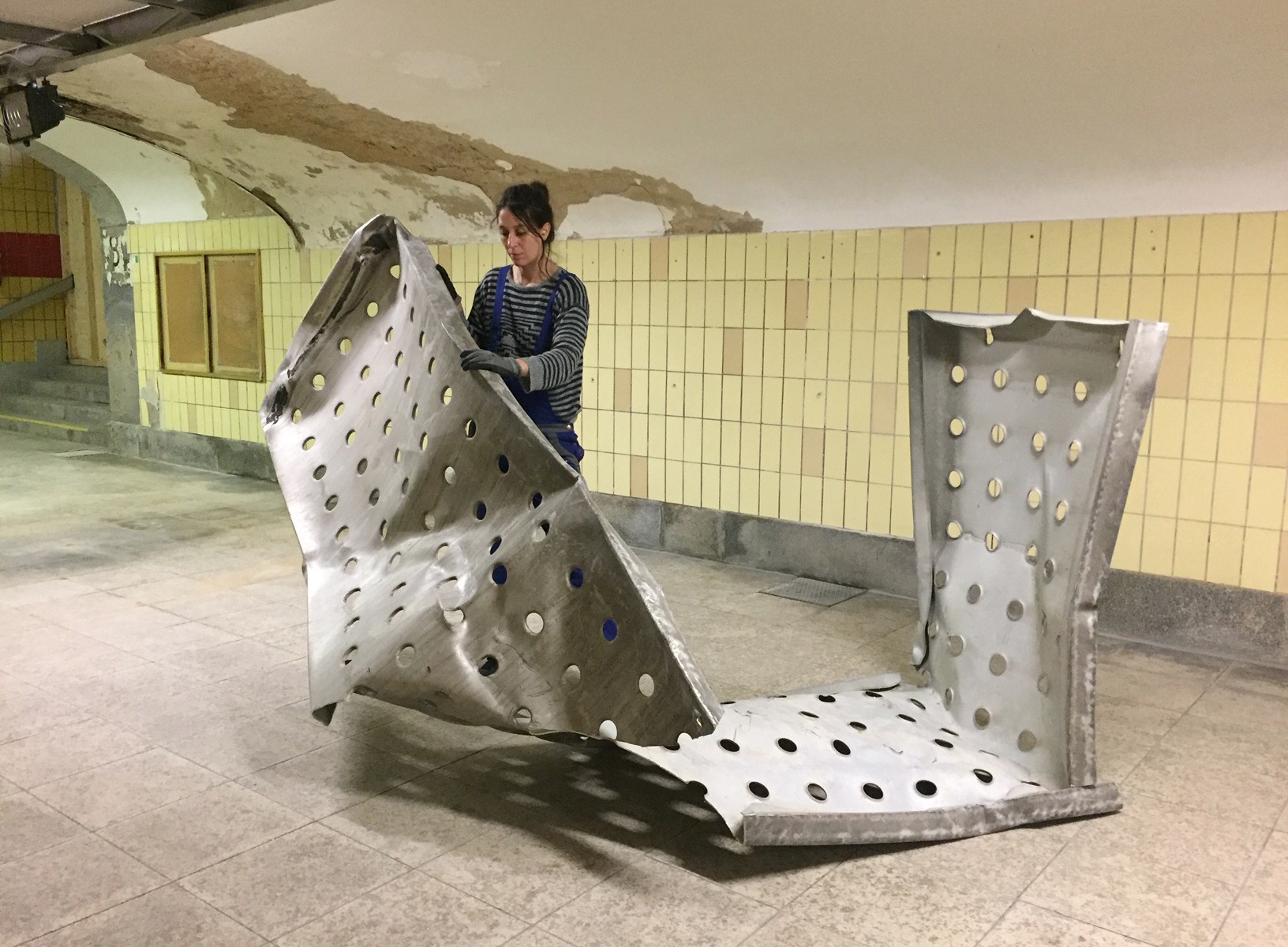 Was im Tunnel angelegt ist, ist – konzeptuell gesehen – ein Fernrohr. Und dann ist da – im Querschnitt – eine halbe Ellipse. Ich bin von meinem Grundverständnis her eine Bildhauerin und deshalb brauche ich etwas, was mich hinauskatapultiert aus dieser Röhre. Ich bin fündig geworden bei einem ausgebrannten Auto. Das Verbrennen und das Verglühen eines Sternes waren mir in den Sinn gekommen. Dieses ausgebrannte Auto ist jetzt das Gefährt, wie ein Platzhalter. Konzeptuelle Kunst hat ja ein intrinsisches Darstellungsproblem. Dagegen kann sich vom Gefährt aus nun etwas Widerständiges entwickeln, um nicht in meinem Fernrohr oder in der Projektion in die Ferne verloren zu gehen. Es ist ein Platzhalter, ein Unort, eine raum-zeitliche Setzung, ähnlich einem Modell, um daraus etwas zu entwickeln. Die extreme Tiefe des Tunnels ist auch spannend. Man kann über Tiefenabstände arbeiten. Ich verfolge im Tunnel tatsächlich einen sehr bildhauerischen Ansatz. Ich arbeite mit etwas sehr Handfestem, mit Ton. Das rudimentär Unspektakuläre finde ich faszinierend und versuche meine Idee sehr bildhauerisch handwerklich umzusetzen. Ton ist ein tolles Material und die Ellipse spielt ihre Rolle in einer künstlerisch transformierten Form.