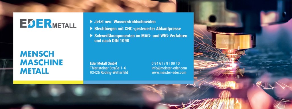 Unter dem Motto „Mensch und Maschine Hand in Hand“ erfuhr die Metallverarbeitung in Wetterfeld 2017 einen neuen Schub. Geschäftsführer Alexander Eder ist innovativ und ein Freund automatisierter Prozesse. An der Schnittstelle Mensch – Maschine setzt er auf handwerklich geschulte Mitarbeiter. An digital gesteuerten Apparaten, darunter eine Wasserstrahlschneidemaschine, setzen sie im neuen Betriebsgebäude am Firmensitz um, was im hauseigenen Konstruktionsbüro erarbeitet wurde.